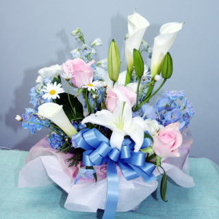 お入れするお花の種類はすべてお任せください 仕入れ状況により異なります とくにご希望があります場合はお申し出下さい 又出産祝い等 男の子 女の子等で色合いを変えさせて頂きます